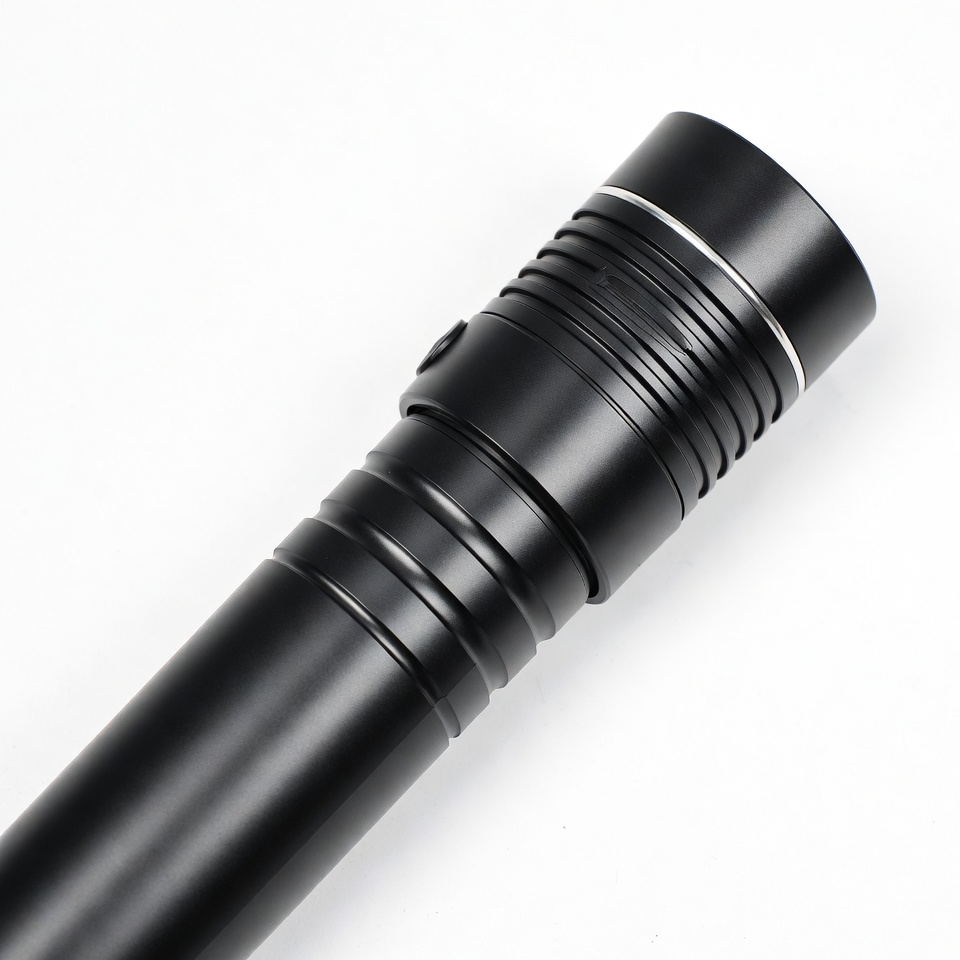 LED flashlight, black flashlight, cylindrical flashlight, emergency light, flashlight grip, flashlight switch, handheld light, isolated background, metal flashlight, portable flashlight, tactical flashlight, torch, white background, flashlight