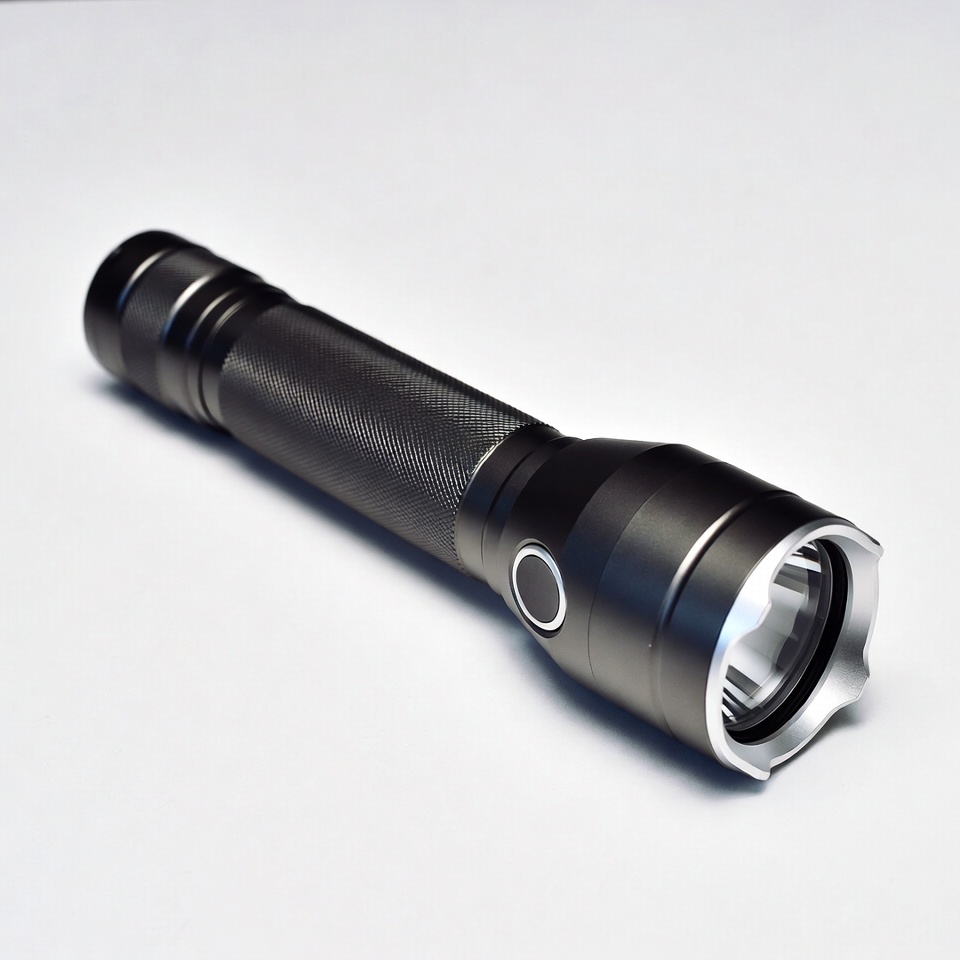 LED flashlight, black flashlight, bright flashlight, emergency light, flashlight grip, flashlight lens, handheld light, isolated flashlight, metal flashlight, portable flashlight, power button, tactical flashlight, torch, white background, flashlight