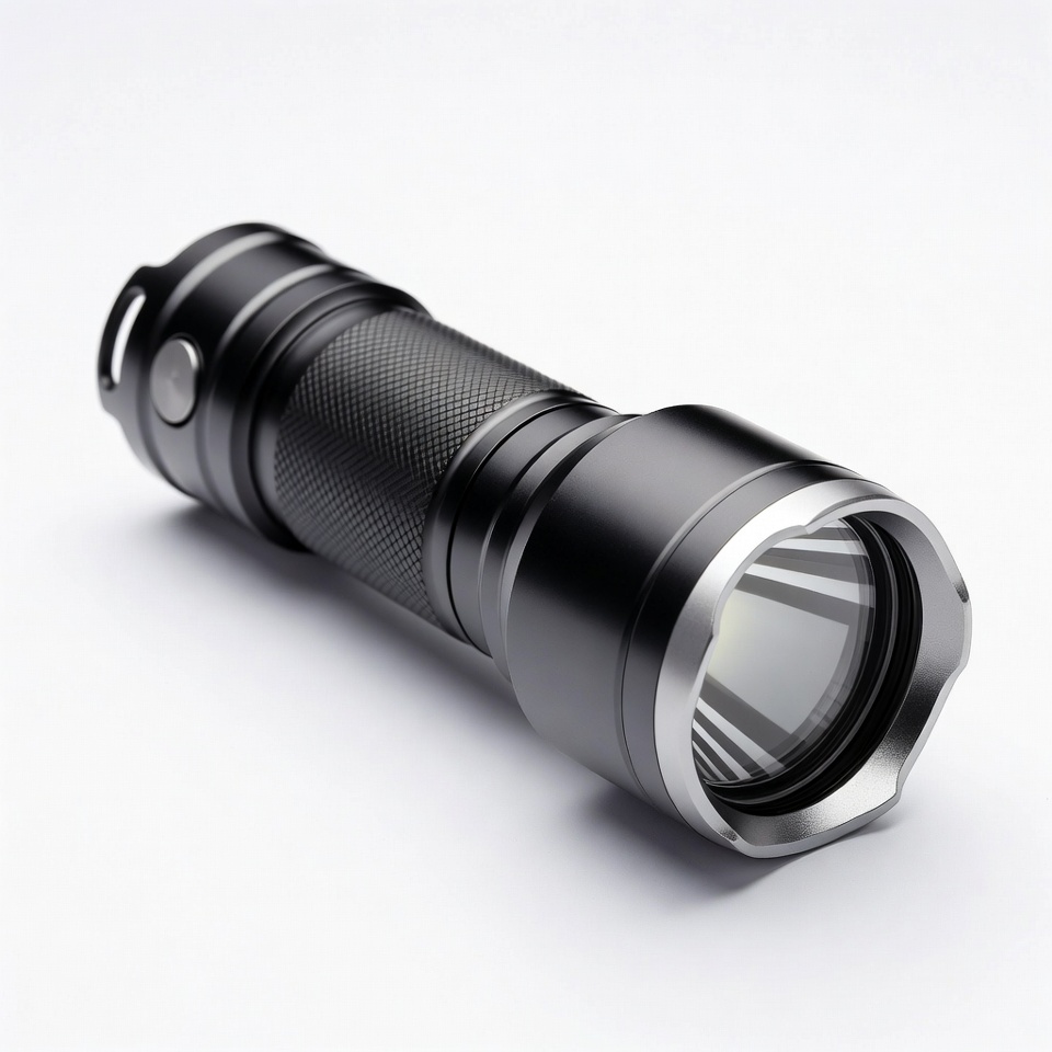 LED light, black flashlight, bright beam, camping light, emergency light, flashlight lens, gadget, grip texture, handheld light, isolated background, metal flashlight, portable flashlight, survival gear, tactical flashlight, tool, torch, white background, flashlight