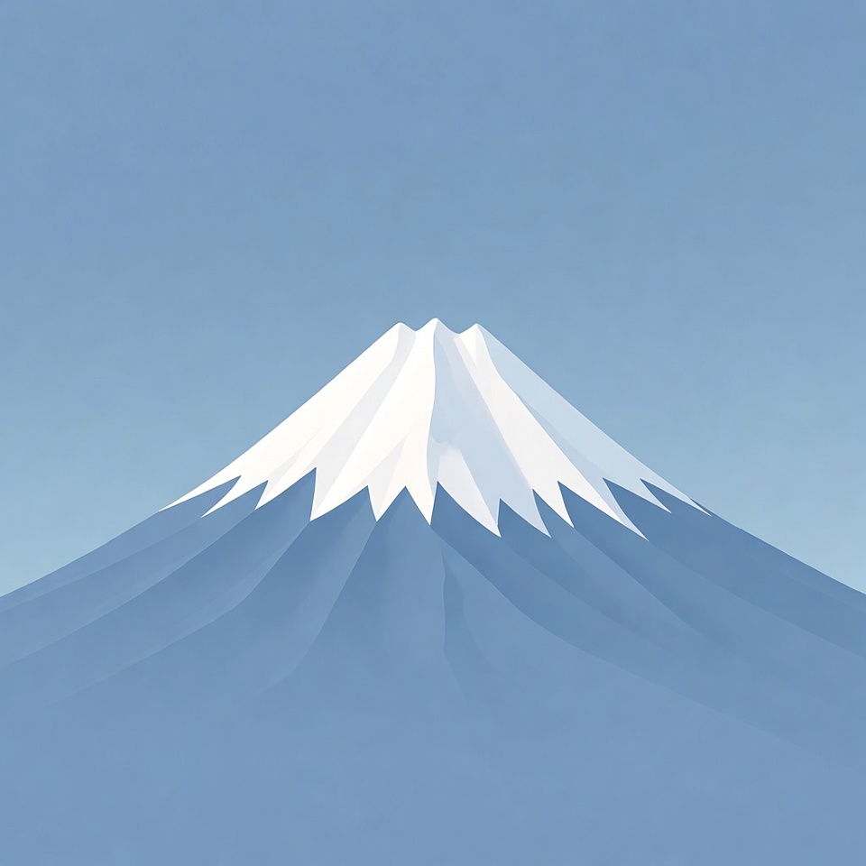 A geometric illustration of Mount Fuji features a snow-capped peak in white against a gradient blue sky. The mountain's slopes are rendered in layered blue polygons for a flat, minimalist design. It stands isolated on a plain blue background.