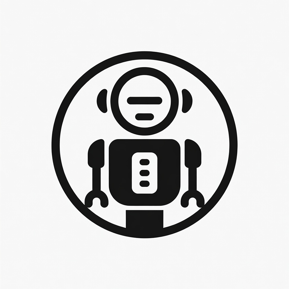 A simple black line art icon depicts a humanoid robot with a round head, antenna ears, and straight arms. The robot stands inside a thick circular outline on a white background. It features panel lines on the chest and mechanical claw hands.