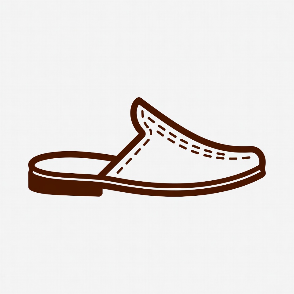 brown outline, clipart, fashion, footwear, illustration, isolated background, line art, mule shoe, open back, sandal, shoe, stitched edges, vector, white slipper, slipper