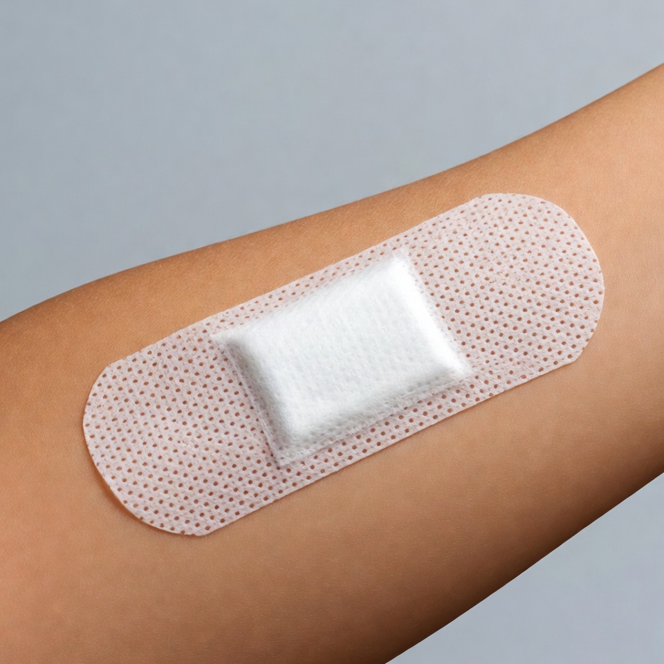 A white adhesive bandage with a gauze pad is applied to a light-skinned human arm. The bandage features a dotted fabric edge and is centered on the forearm. The arm is positioned against a plain light blue background.