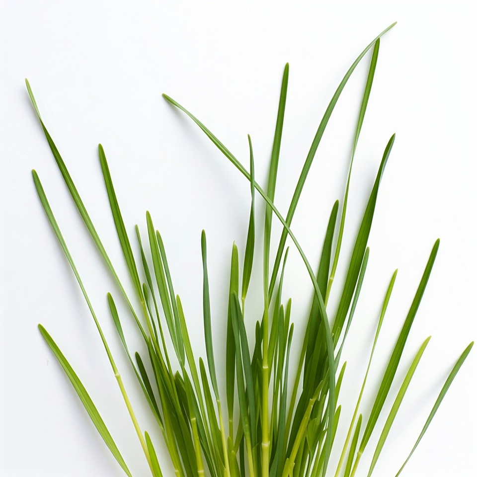 A cluster of fresh green grass blades stands upright on a plain white background. The blades vary in height and curve slightly, creating a natural bunch. The isolated arrangement highlights the vibrant green color and fine textures.
