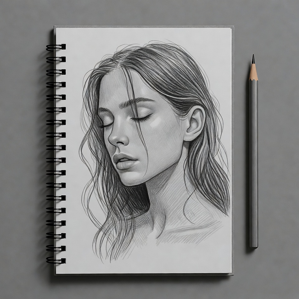 A detailed pencil drawing of a young woman with long wavy hair fills the page of an open spiral-bound sketchbook. She has her eyes closed and lips slightly parted, rendered in realistic shading with soft highlights. A pencil lies beside the sketchbook on a gray surface.