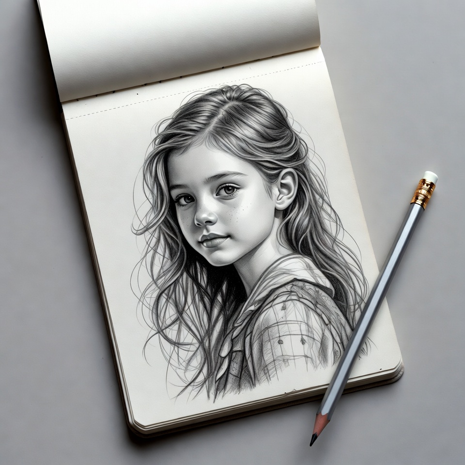 A detailed pencil drawing of a young girl with long wavy hair is depicted on an open sketchbook. She wears a checkered blouse and gazes softly to the side. A pencil lies beside the open notebook on a plain background.