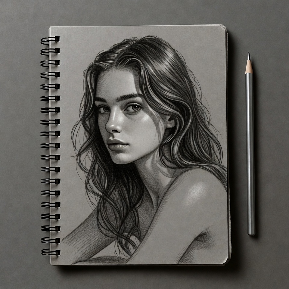 A detailed pencil drawing of a young woman with long wavy hair and striking features is portrayed on a spiral-bound sketchbook page. She gazes slightly to the side with a subtle expression, her bare shoulders visible. A pencil lies beside the open sketchbook on a gray surface.