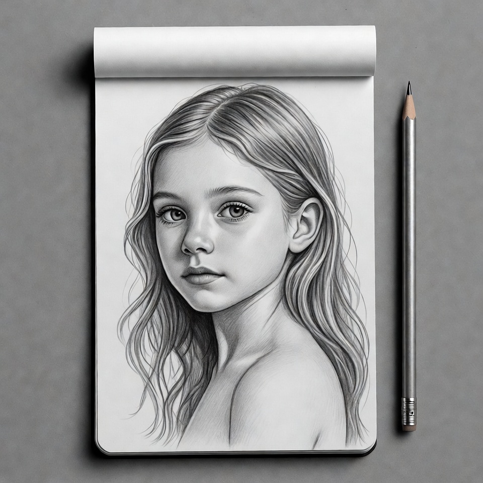A detailed pencil sketch of a young girl with long wavy blonde hair is drawn on a white notepad. She has large expressive eyes and a gentle expression, shown from the shoulders up in profile view. A graphite pencil lies beside the open sketchpad on a gray surface.