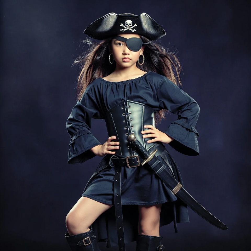 A young Asian girl with long dark hair wears a pirate costume featuring a black tricorn hat with skull emblem, eyepatch, navy off-shoulder blouse, leather corset, skirt, sword, and boots. She stands confidently with hands on hips against a dark gradient background. Her hair flows dynamically, enhancing the adventurous pirate pose.