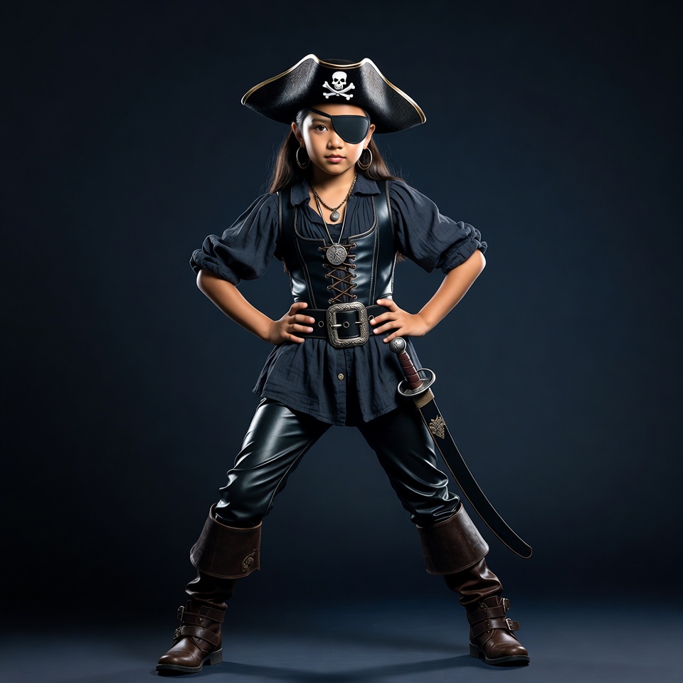 Asian, Asian girl, Halloween costume, child pirate, corset, dark background, eyepatch, female pirate, girl, hands on hips, isolated background, leather pants, pirate boots, pirate costume, pirate hat, pirate sword, ruffled shirt, skull emblem, standing pose, tricorn hat, young girl, pirate girl