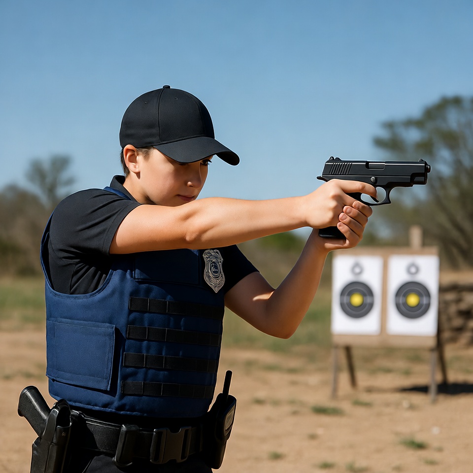 A young Asian person in a navy blue police vest and black cap aims a black handgun at yellow bullseye targets during target practice. They wear a black polo shirt, black pants with a duty belt, and stand on a grassy field with trees in the background under a clear blue sky. Two white target backboards with yellow centers are positioned ahead.