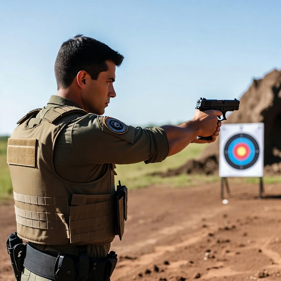 A Latino man in military uniform aims a black handgun at a colorful bullseye target during shooting practice. He wears tactical gear including a vest, shoulder patches, and belts with holsters, standing on a dirt range with grass and hills in the background. His stance is focused and steady with both hands gripping the pistol.