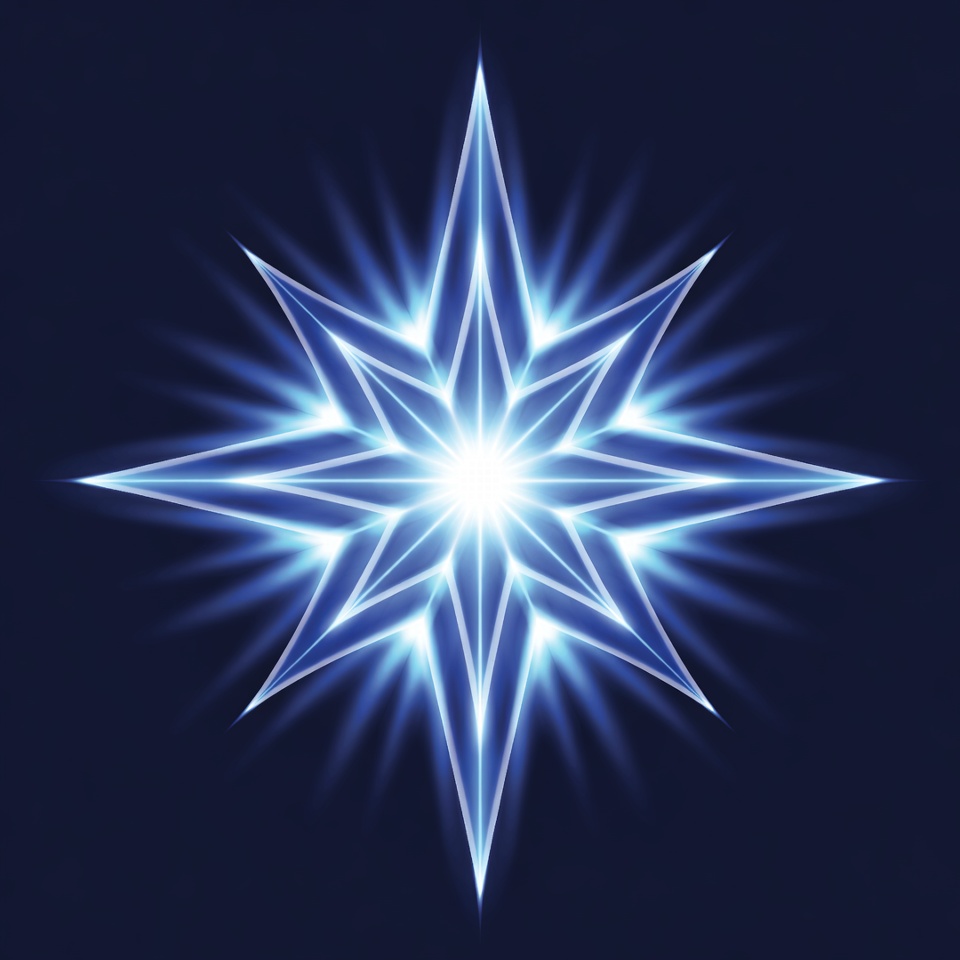 A radiant blue starburst with sharp eight-pointed rays glows brightly against a dark navy background. The design features intense white highlights along the edges of each point, creating a luminous effect. The symmetrical shape dominates the isolated dark space.