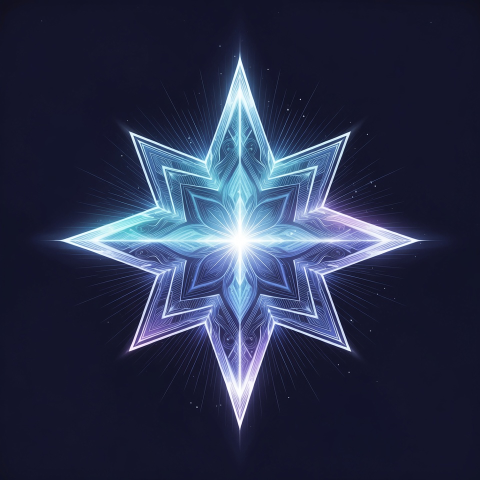 A radiant blue starburst with intricate, symmetrical patterns glows brightly against a dark navy background. The design features sharp, angular points and layered cyan and purple hues with sparkling light effects. It appears as a digital illustration isolated on a solid black backdrop.