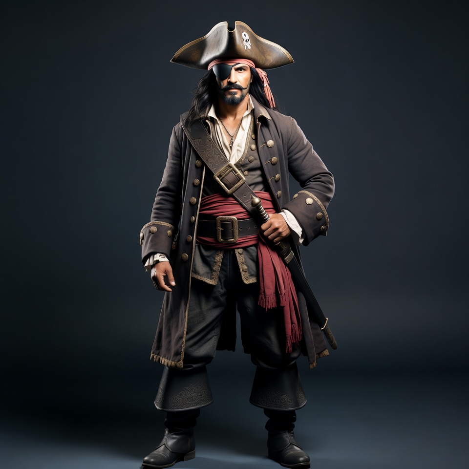 adventure costume, beard, brown coat, buccaneer, dark background, eye patch, isolated background, long hair, male, man, pirate costume, pirate outfit, pirate sword, red bandana, red sash, sea pirate, swashbuckler, tricorn hat, pirate