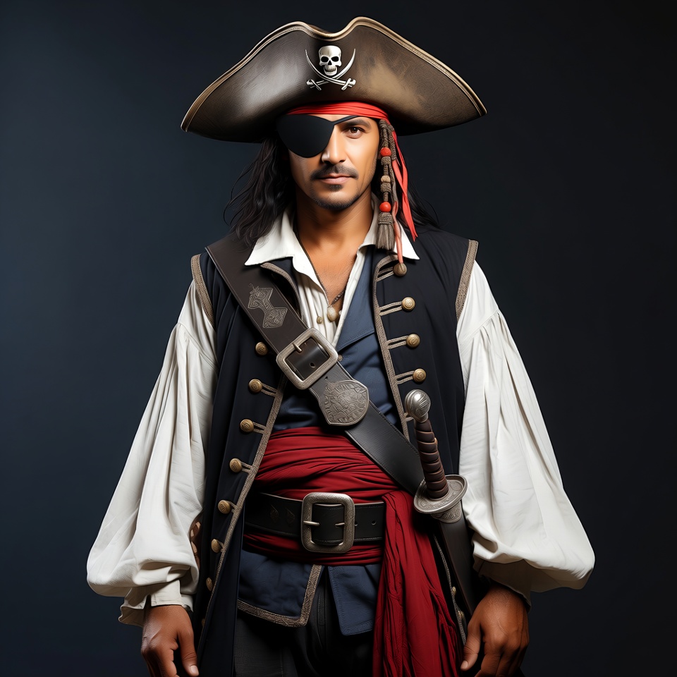 A man with long dark hair and a mustache wears a classic pirate outfit including a tricorn hat with skull and crossbones, red bandana, black eyepatch, white ruffled shirt, blue vest, red sash, and sword. He stands confidently against a dark background. His expression is serious and adventurous.