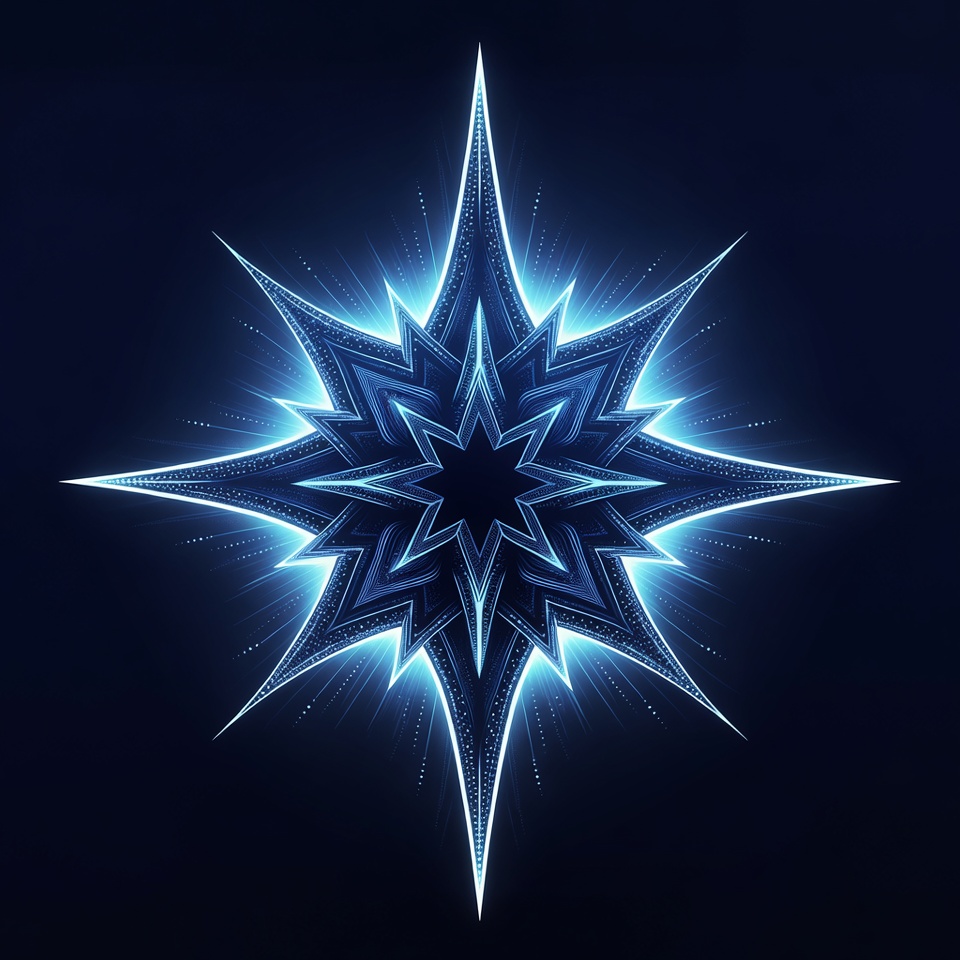 A radiant blue starburst with sharp, angular points glows intensely against a dark black background. Intricate glowing lines and edges create a symmetrical, futuristic design. The neon blue light effects emphasize its sharp spikes and central star shape.