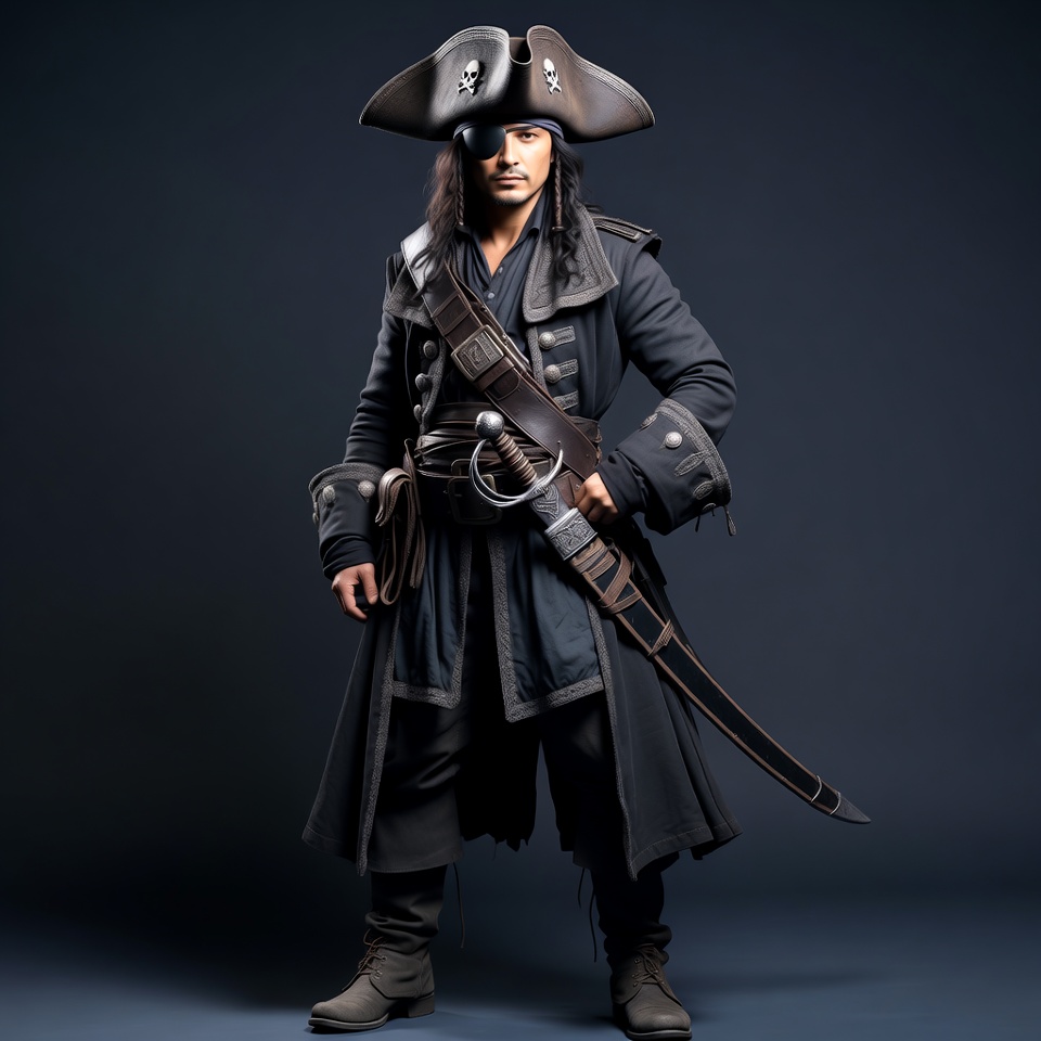 A man dressed as a pirate stands confidently on a dark background. He wears a large tricorn hat with skull emblem, long braided hair, and an eye patch. His detailed pirate coat features belts, a sheathed sword at his side, and boots.