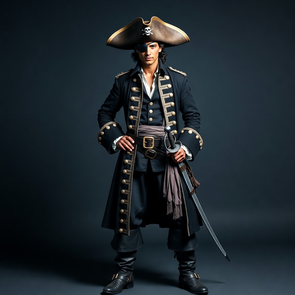 A man with long dark hair and an eyepatch wears a detailed pirate costume including a large tricorn hat, navy blue coat with gold buttons, and boots. He stands confidently with hands on hips, holding a sheathed sword at his side. The image features a dark isolated background.