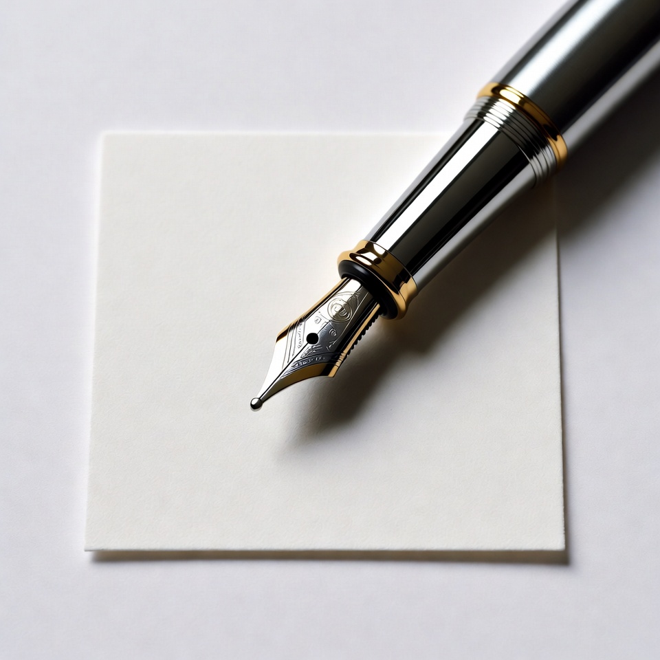 A shiny silver fountain pen with gold accents rests diagonally on a square of white paper. The pen's fine nib points towards the paper's edge. The background is plain white, creating a clean, isolated composition.