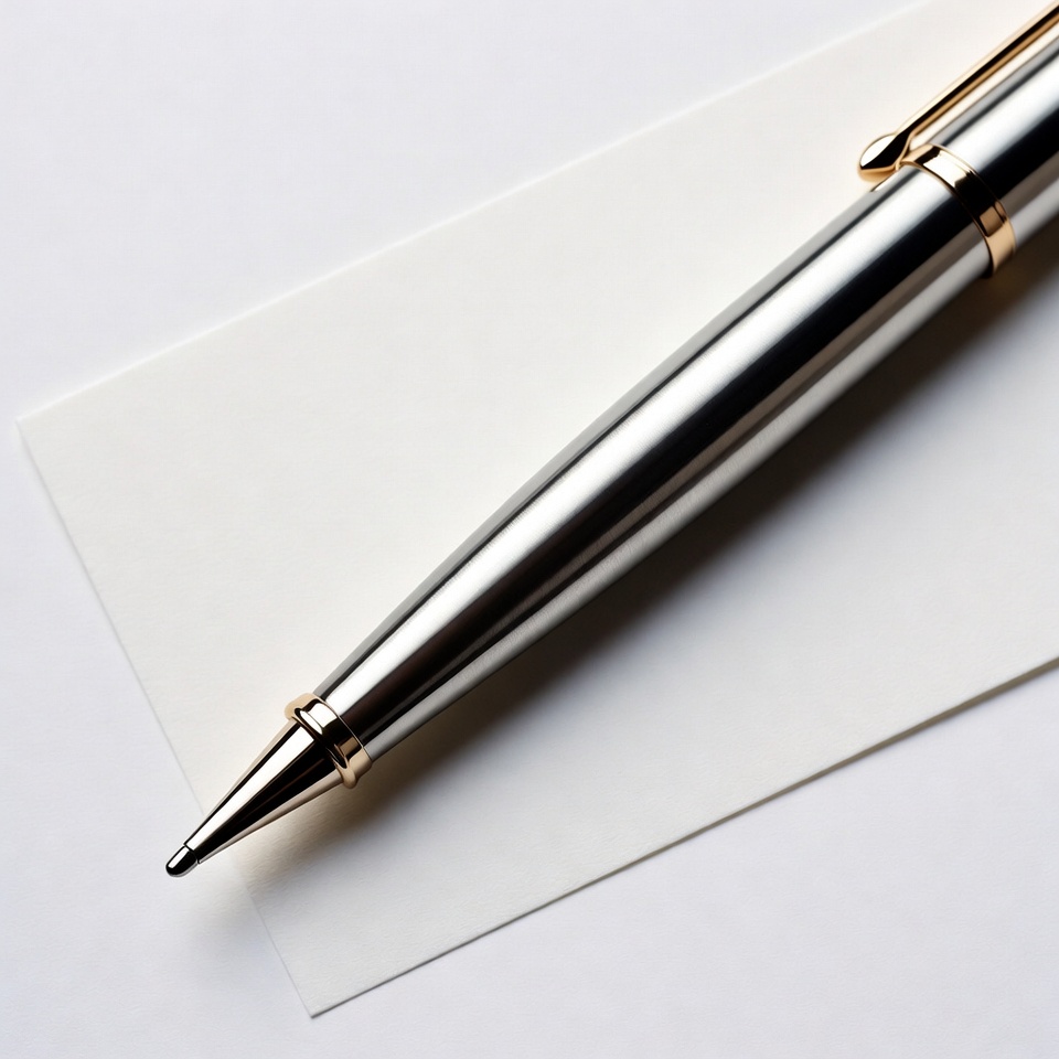 ballpoint pen, blank paper, close-up, diagonal angle, gold accents, gold trim, isolated background, luxury pen, metallic pen, office supplies, silver pen, white paper, writing instrument, writing pen, pen