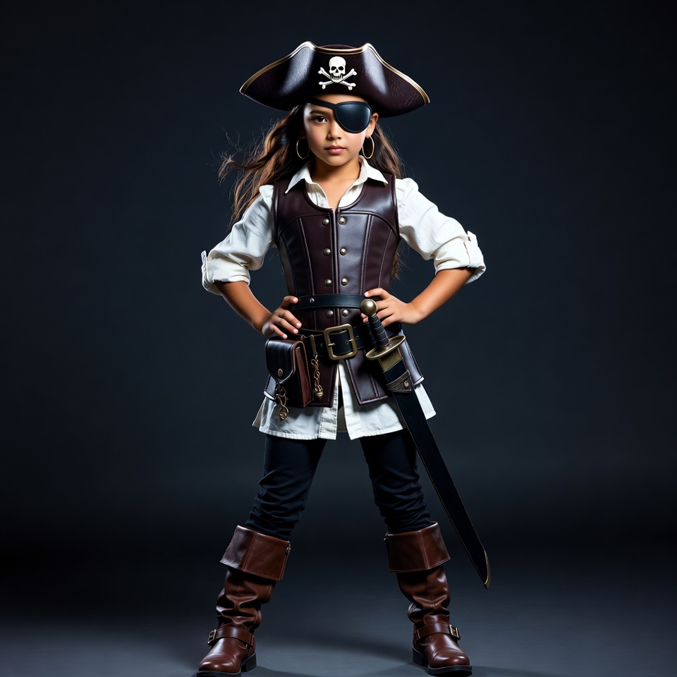A young girl with long brown hair wears a pirate costume including a tricorn hat with skull emblem, eyepatch, white shirt, brown vest, black pants, and boots. She stands confidently with hands on hips, holding a sword at her side. The image is set against a solid black background.