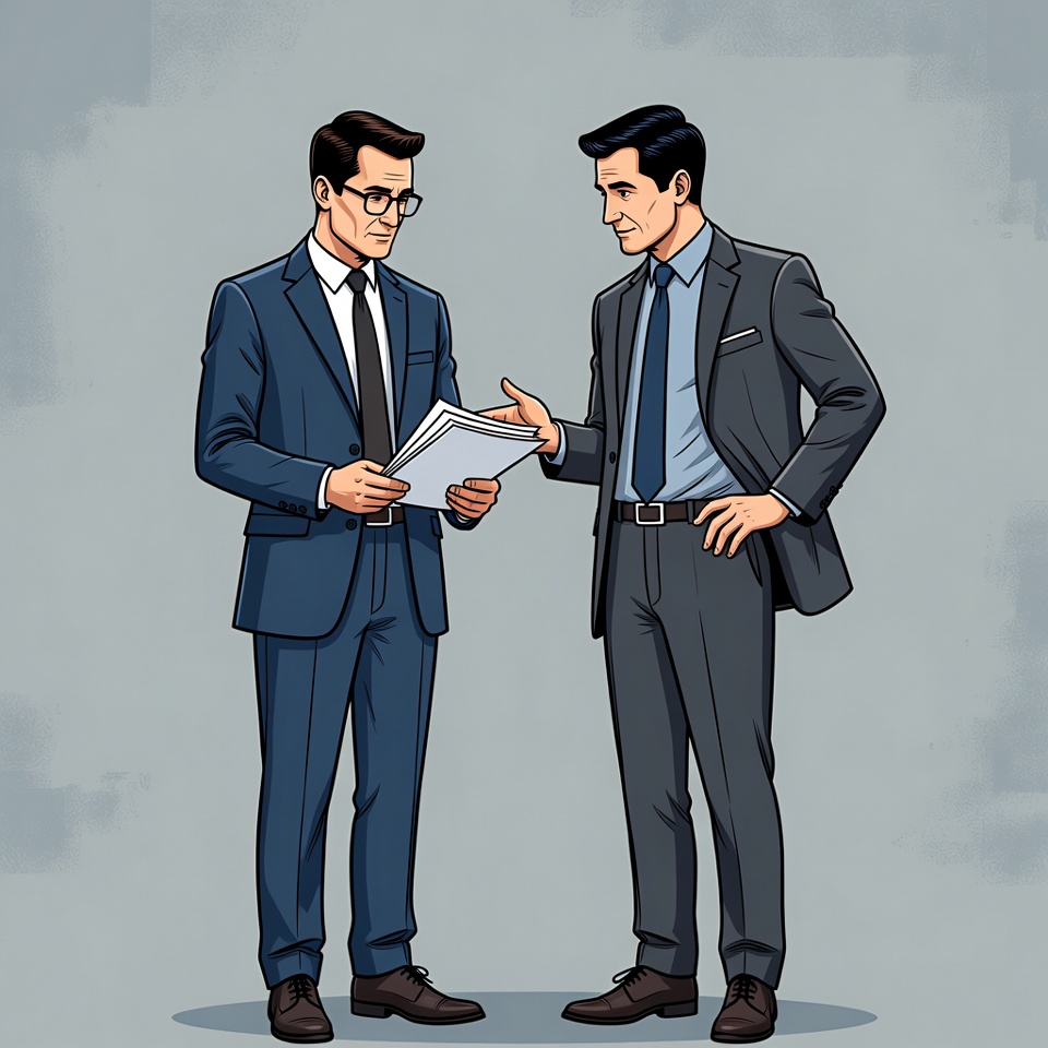 Two men in suits stand facing each other on a gray background in a flat illustration style. One man with glasses holds a large document while gesturing, and the other man in a blue suit gestures back seriously. Both wear ties, dress shoes, and formal attire.