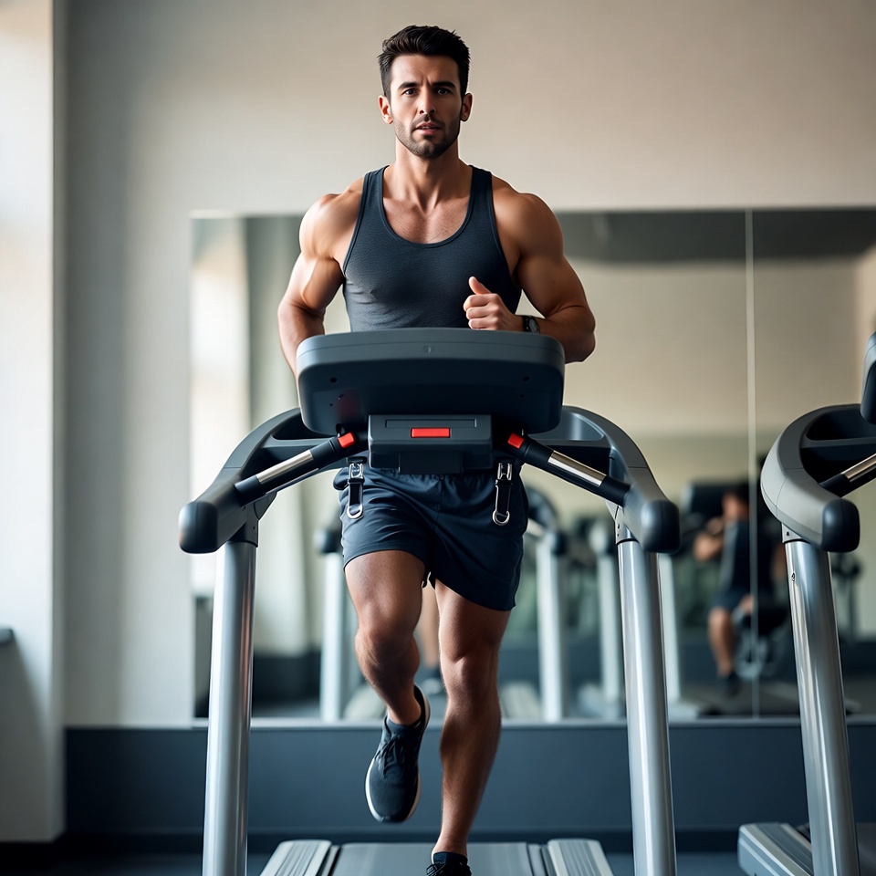 A muscular man with dark hair runs on a treadmill in a modern gym. He wears a black tank top and shorts, with his arms pumping and focused expression. Mirrors line the gym walls, reflecting the equipment and his form.