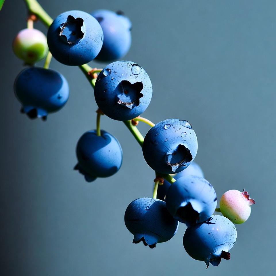 berries, blue fruit, blueberry branch, blueberry cluster, blueberry stem, closeup, dew drops, fresh blueberries, fresh fruit, fruit, green stem, juicy blueberries, macro photography, nature, pink berries, plant, ripe blueberries, unripe berries, water droplets, blueberries
