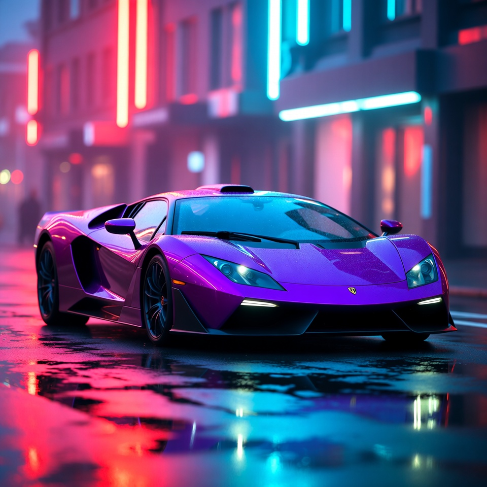 Porsche, angular design, brick buildings, cityscape, cyan neon, cyberpunk, digital art, futuristic car, glossy paint, headlights, low angle, luxury car, neon lights, night street, pink neon, purple car, rain puddles, reflections, sports car, supercar, urban, vibrant colors, wet road, purple supercar