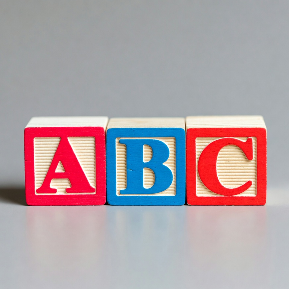 Three wooden alphabet blocks spell out ABC on a gray background. The A and C blocks are red with white wood sides, while the B block is blue. They are arranged in a row and isolated for clear visibility.