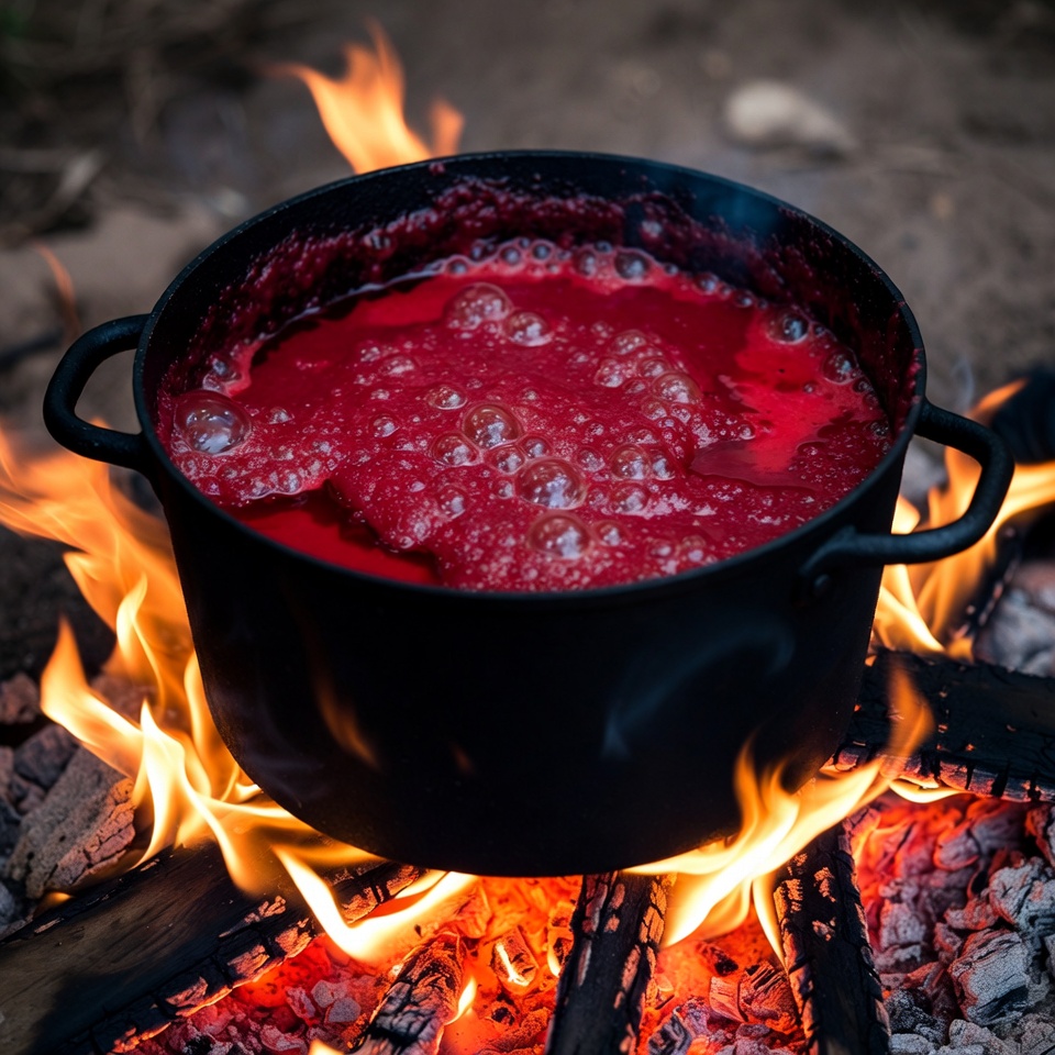 Boiling Red Liquid in Campfire Pot