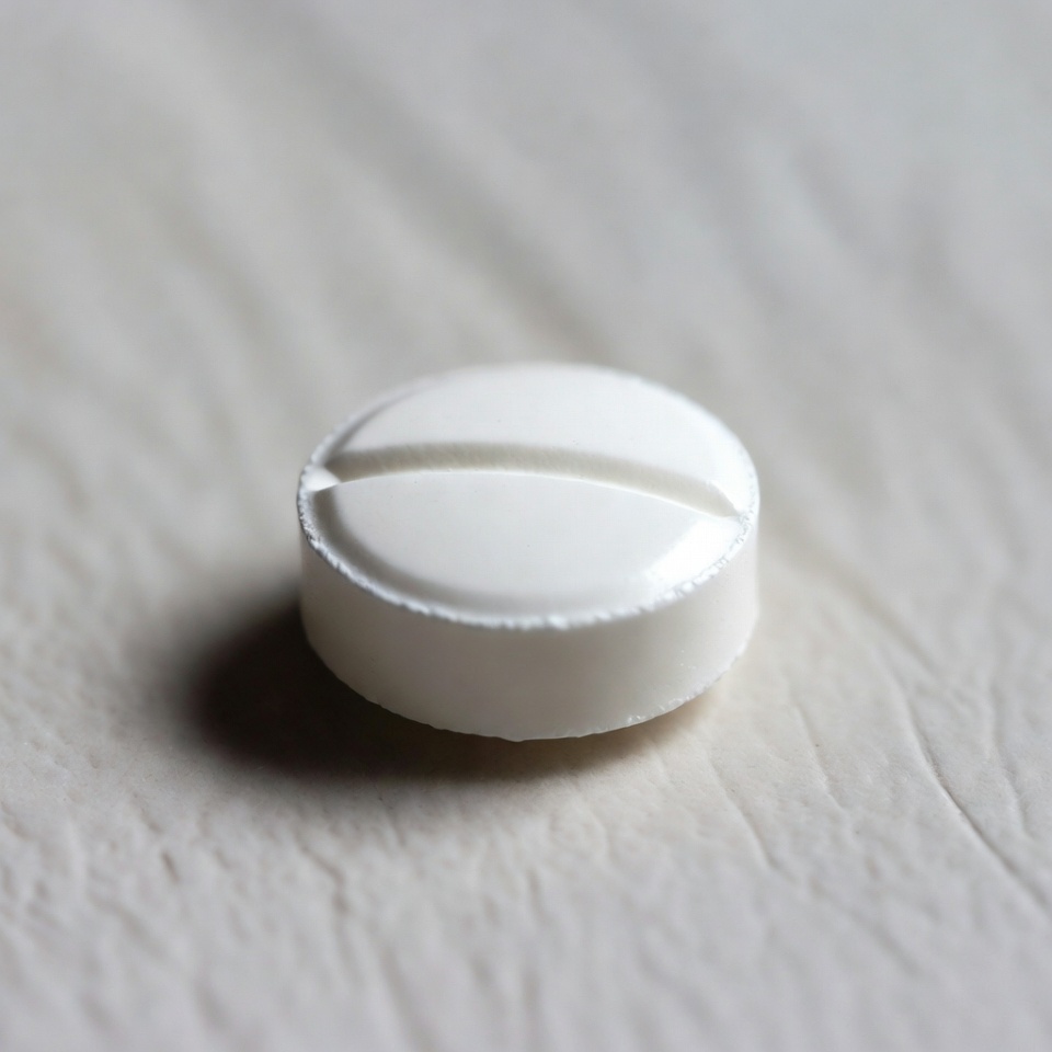 A single round white pill with a score line down the center rests on a smooth white surface. The pill has a glossy coating and casts a subtle shadow. It is centered in the frame against a plain background.