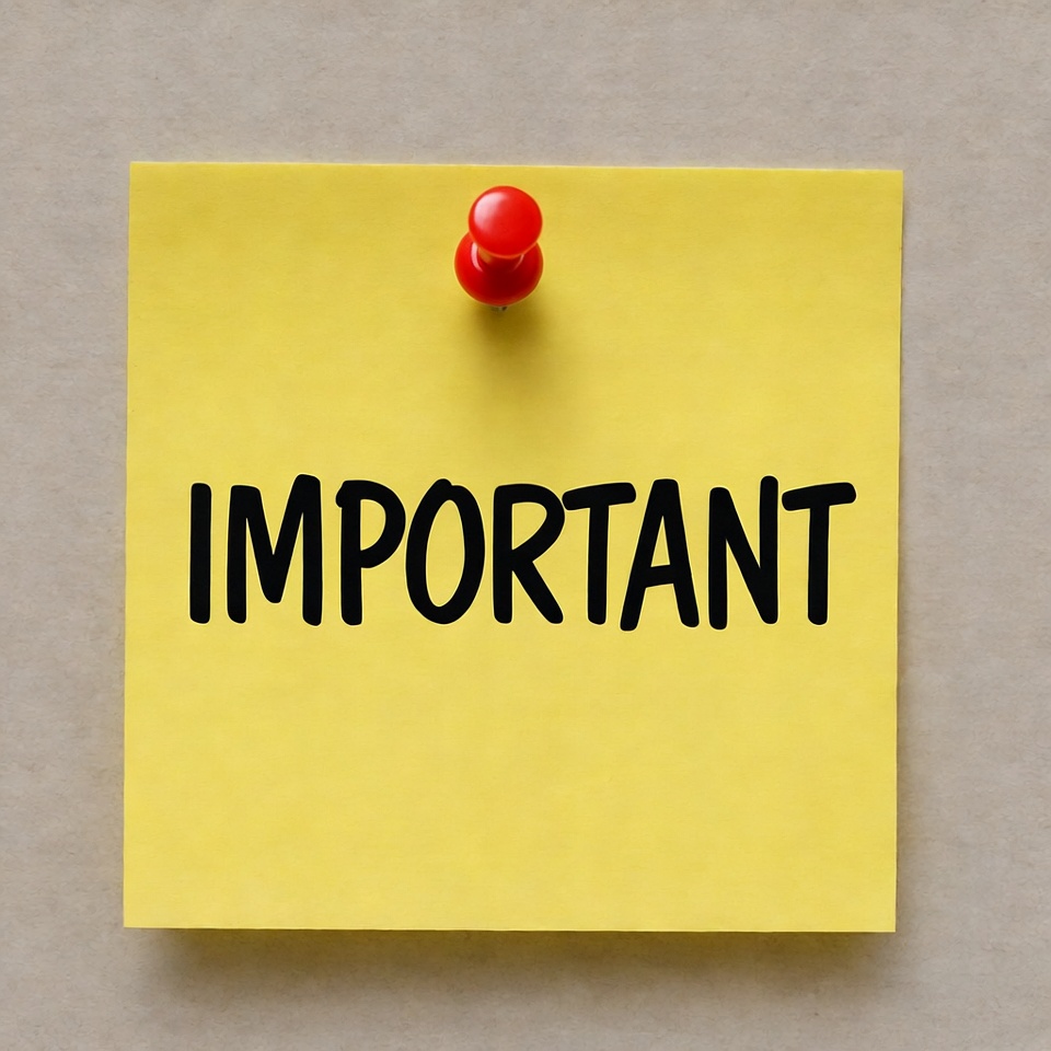 beige background, black letters, bold text, bulletin board, clipart, important, isolated, message, note paper, office supply, post-it note, push pin, red pushpin, reminder note, yellow note, sticky note
