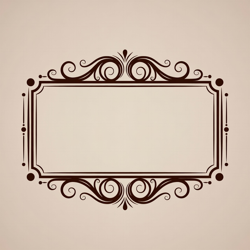 An intricate vintage-style frame with elaborate swirling flourishes and corner decorations surrounds a blank rectangular space. The frame features detailed filigree patterns in dark brown on a light beige background. It is isolated and suitable for labels or certificates.