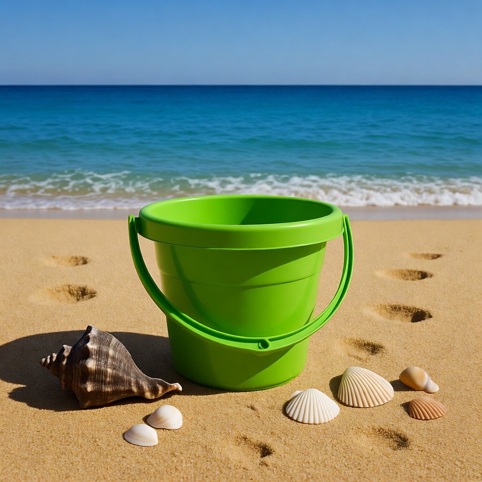 A green plastic beach bucket sits in the sand near the ocean with gentle waves in the background. Scattered around it are various seashells including conch shells and scallop shells. Footprints are visible in the sandy beach under a clear blue sky.