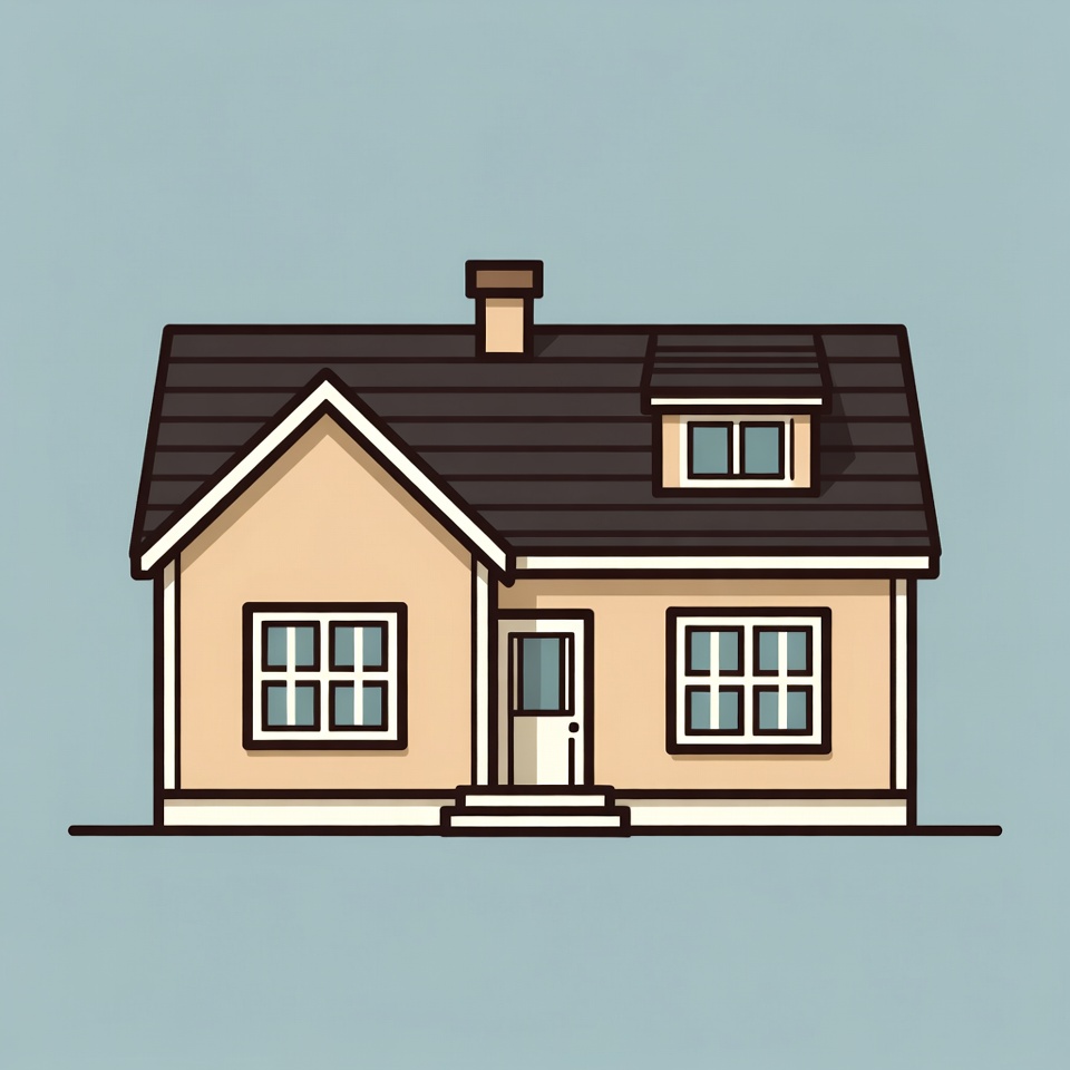 A simple line art illustration of a beige house with a dark sloped roof and chimney. It features multiple windows, a front door with steps, and a small dormer window. The house is centered on a solid light blue background.