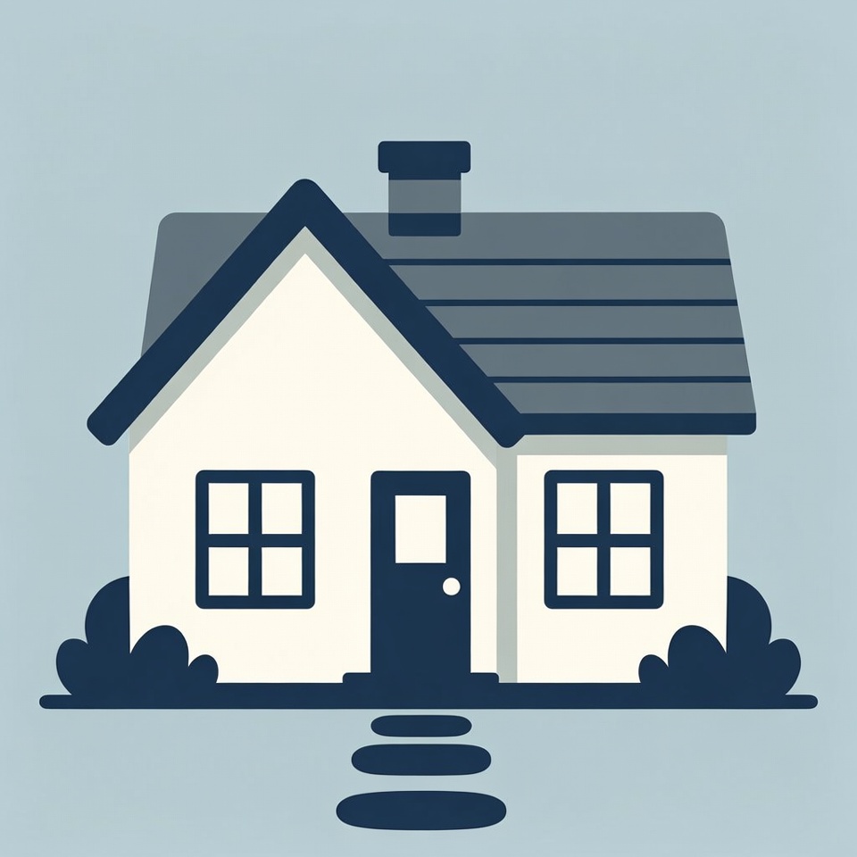 A minimalist flat illustration of a white house with a gray sloped roof and chimney. It features two square windows, a dark front door, and small bushes on either side. The house stands on a light blue background with a few steps leading to the door.