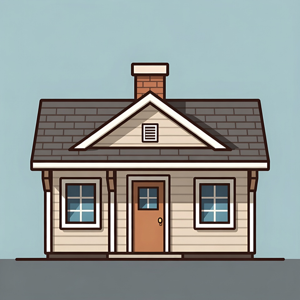 A simple flat illustration of a house features beige siding, a gray shingled roof, and a brick chimney. It has blue windows, an orange front door on a small porch, and a light blue sky background. The house stands isolated on a flat surface.
