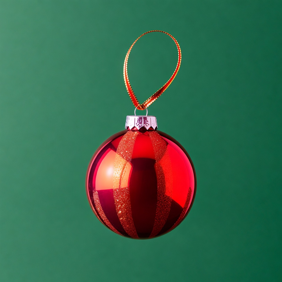 Christmas ball, bauble closeup, festive decor, glossy finish, gold stripes, green background, hanging ribbon, holiday decoration, isolated background, metallic cap, orange ribbon, ornament hanging, red bauble, shiny ornament, Christmas ornament