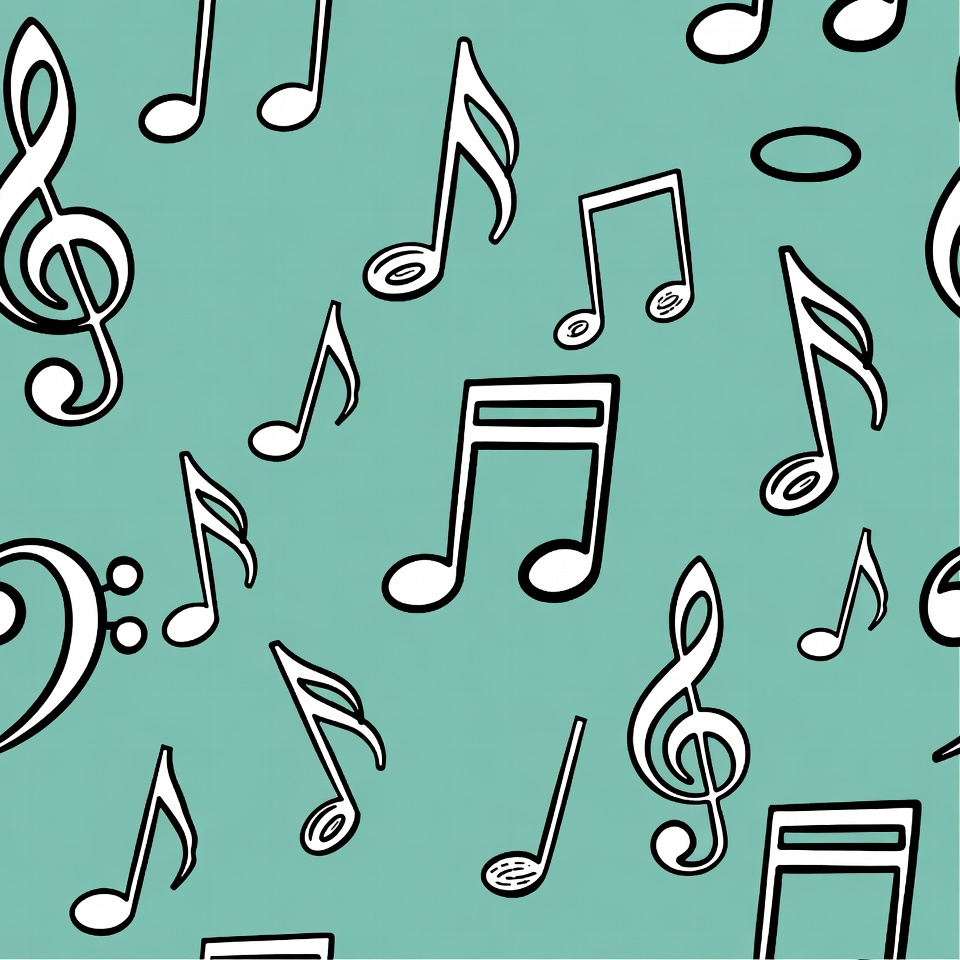 background pattern, bass clef, cartoon notes, clipart, eighth notes, hand drawn, illustration, music pattern, music wallpaper, musical clipart, musical symbols, note pattern, repeating pattern, seamless pattern, teal background, treble clef, vector art, white notes, music notes