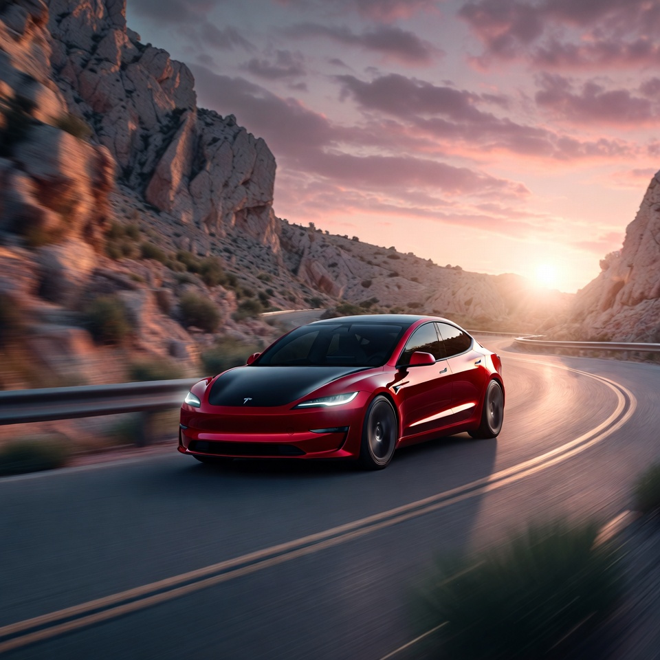 A red Tesla Model 3 electric car drives along a winding mountain road at sunset. The vehicle is captured in motion with a blurred effect, surrounded by rocky cliffs and sparse vegetation. The sky features vibrant pink and orange hues from the setting sun.