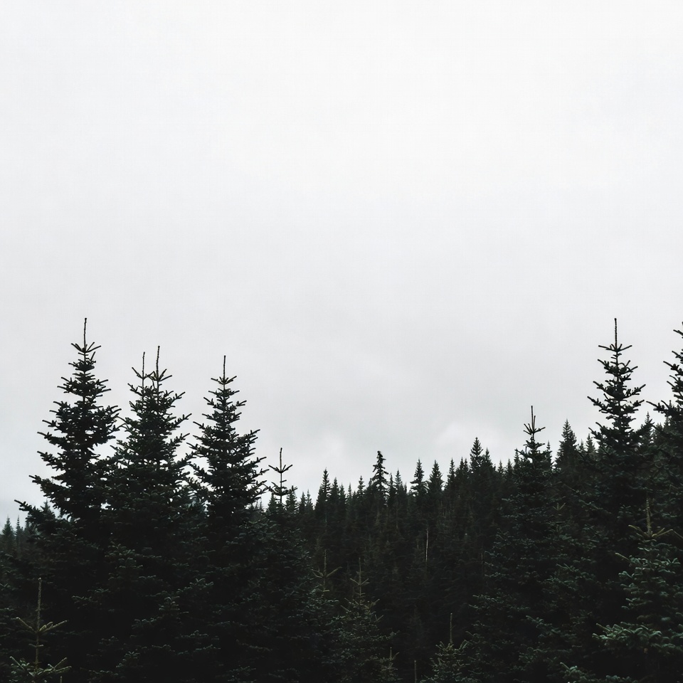 coniferous trees, evergreen trees, fir trees, foggy sky, forest, gray sky, misty forest, nature, overcast, silhouette, tree line, trees, wilderness, woods, pine trees