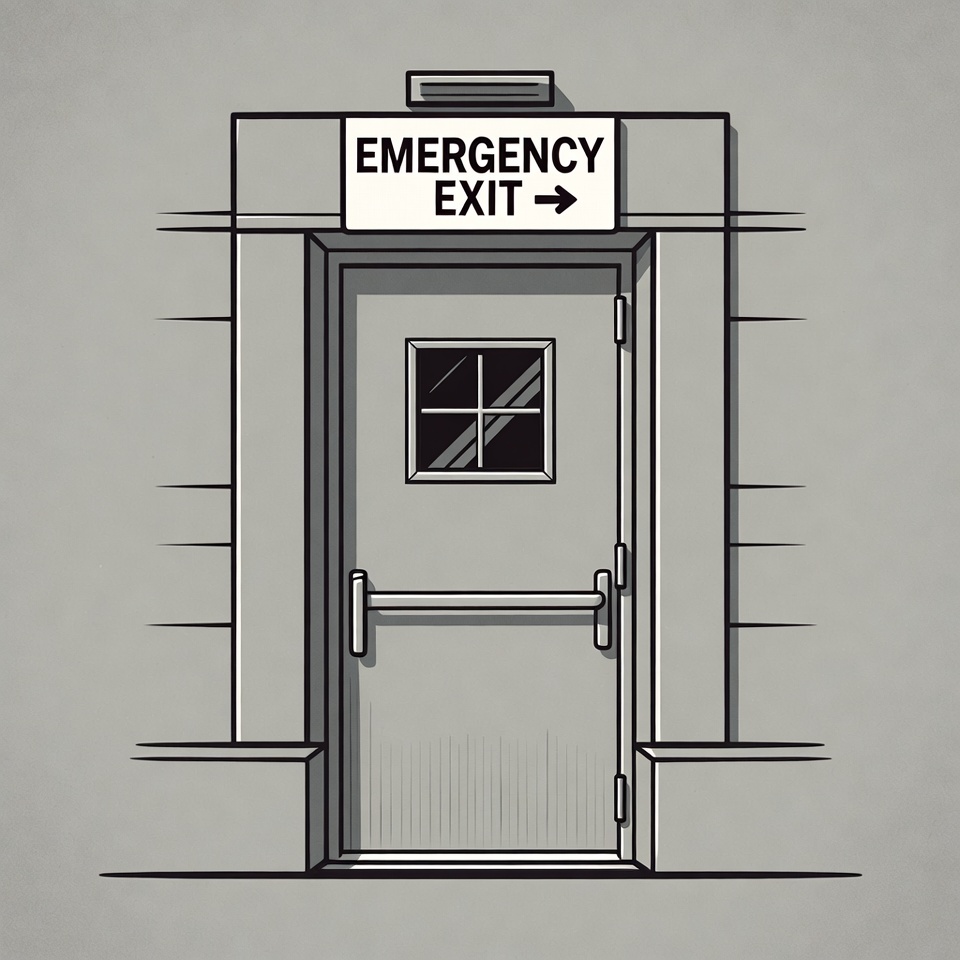 A line drawing illustration depicts a gray emergency exit door with a white sign above it reading 'EMERGENCY EXIT' and an arrow pointing right. The door features a small square window with crossbars and a horizontal push bar handle. It is framed by concrete walls on a plain isolated background.