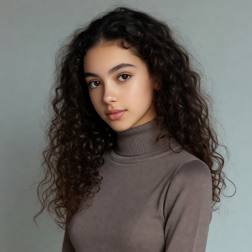 A young woman with long, voluminous curly brown hair gazes slightly to the side against a plain gray background. She wears a fitted gray turtleneck sweater that accentuates her features. Her expression is soft with subtle makeup highlighting her eyes and lips.