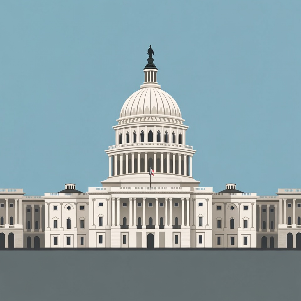 A flat vector illustration of the United States Capitol Building features its iconic white dome topped with a statue. The building has symmetrical wings with columns and arched windows on a solid blue sky background. The design is simple and isolated with clean lines.