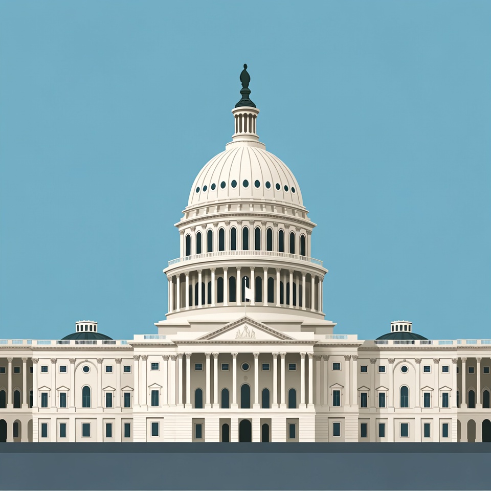 A flat illustration of the US Capitol Building features a white dome with black accents against a solid blue background. The structure includes columns, smaller domes on the wings, and a statue atop the main dome. It is depicted in a minimalist vector style on an isolated background.