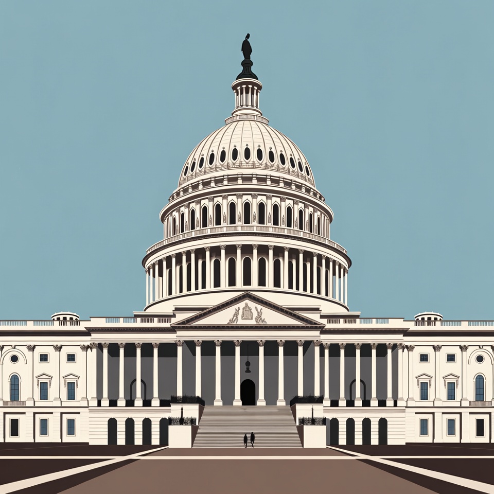A flat vector illustration of the United States Capitol Building against a blue sky. The iconic white dome and neoclassical facade with columns are prominently featured. Two small silhouetted figures stand at the base of the front steps.
