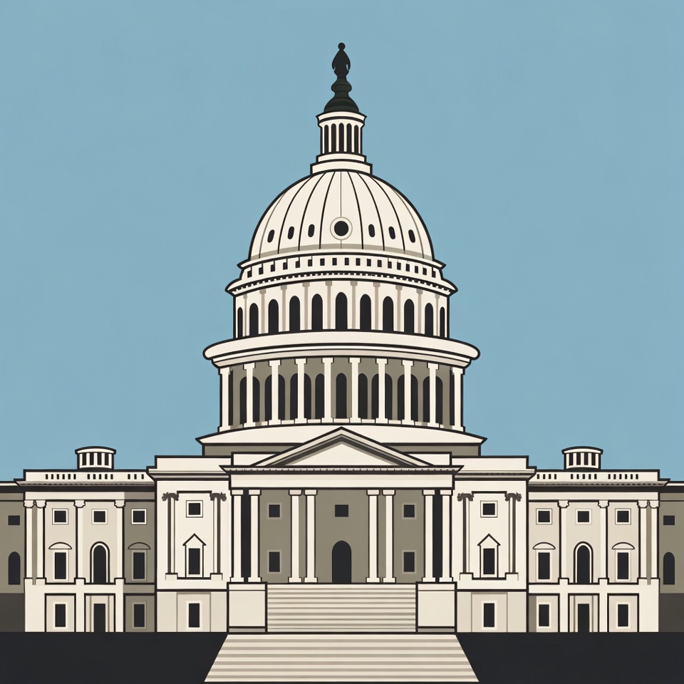 A line art illustration of the US Capitol Building features a prominent white dome with a statue on top. The neoclassical facade includes columns, wings on both sides, and steps leading to the entrance. It is set against a solid blue background.
