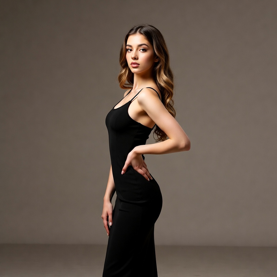 A young woman with long wavy brown hair stands in a side profile pose wearing a form-fitting black spaghetti strap dress. Her hand rests on her hip, accentuating her figure against a plain beige background. She gazes slightly to the side with a subtle expression.